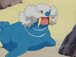 In Training Wrecks, Rocky used a Walrein and Quagsire in his battle against Ash, and the two faced off against his Pikachu and Grovyle. Before Grovyle could attack Quagsire with its Leaf Blade, Walrein attacked Grovyle with its Ice Ball. Pikachu defeated Walrein in the end, while Grovyle took care of Quagsire.