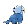 Walrein is a large, walrus-like Pokémon with a layer of blubber under its skin. It is primarily blue, with thin, white rings around its neck and lines on its fan-like tail-fin. There are two long, ivory tusks in its upper jaw. It has a round snout and yellow eyes, and large tufts of white fur about its face and neck. Its four short legs have long flippers instead of feet.