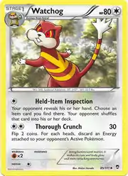 Watchog (Japanese: ミルホッグ Miruhog) is a Colorless-type Stage 1 Pokémon card. It is part of the Furious Fists expansion.