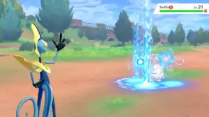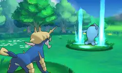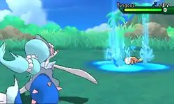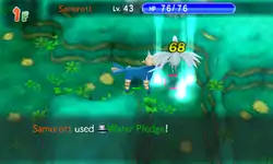 | Samurott causes rain to fall on the opponent. When combined with Fire Pledge or Grass Pledge, Samurott forms the attack into a rainbow or a swamp that sprouts vines that surround the opponent. | |||