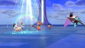 | Oshawott causes rain to fall on the opponent. When combined with Fire Pledge or Grass Pledge, Oshawott forms the attack into a rainbow or a swamp that sprouts vines that surround the opponent. | |||