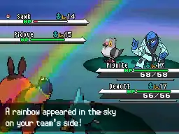 | Dewott causes rain to fall on the opponent. When combined with Fire Pledge or Grass Pledge, Dewott forms the attack into a rainbow or a swamp that sprouts vines that surround the opponent. | |||