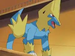 Manectric is Wattson's main Pokémon. He first appeared as an Electrike being used against children who wanted to challenge Wattson and won easily. Sometime later, he evolved into a Manectric, becoming large enough to serve as Wattson's land transportation. | ||