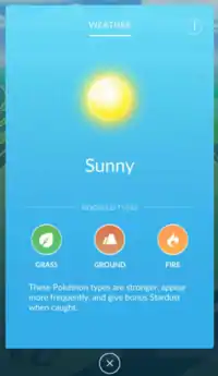 - Sunny: Boosts Fire-type attacks by 50%. Additionally, Pokémon cannot be frozen, and previous Pokémon that were frozen prior to the weather condition being implemented will not be frozen anymore after the weather takes effect.