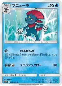 Weavile (Japanese: マニューラ Manyula) is a Water-type Stage 1 Pokémon card. It is part of the Cosmic Eclipse expansion.