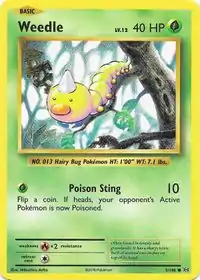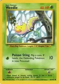 Weedle (Japanese: ビードル Beedle) is a Grass-type Basic Pokémon card. It was first released as part of the Base Set.