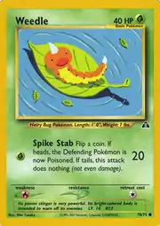 Weedle (Japanese: ビードル Beedle) is a Grass-type Basic Pokémon card. It is part of the Neo Discovery expansion.