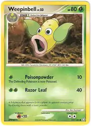 Poison Powder, formatted on this card as Poisonpowder, and Razor Leaf are both moves in the Pokémon games that Weepinbell can learn. This card's Pokédex entry comes from Pokémon Diamond and Pearl.
