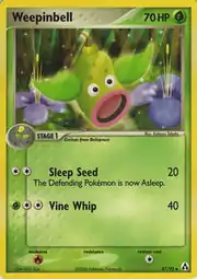 Weepinbell (Japanese: ウツドン Utsudon) is a Grass-type Stage 1 Pokémon card. It is part of the EX Legend Maker expansion.