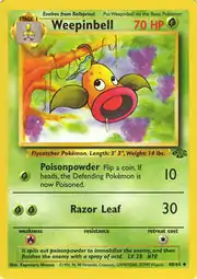 Poison Powder, formatted on this card as Poisonpowder, is a move in the Pokémon games that Weepinbell can learn. Razor Leaf is a move in the Pokémon games that Weepinbell can learn. This card's English Pokédex entry comes from Pokémon Red and Blue, though it is slightly reworded. The Japanese entry comes from Pokémon Red and Green.