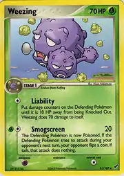 Weezing (Japanese: マタドガス Matadogas) is a Grass-type Stage 1 Pokémon card. It is part of the EX Deoxys expansion.
