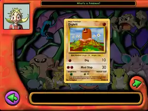 In the first screen, Julie introduces the concept of Pokémon cards, while a Diglett is shown as an example. The player is able to click on several components of the Diglett card, which causes Julie to explain shortly about it. Specifically, the player is able to click on Diglett's stage (Basic Pokémon), species, image, HP, type (![]()
