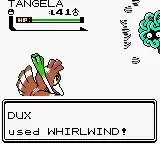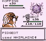 • In the Japanese versions of Pokémon Red, Green, and Pokémon Blue, if the player's Pokémon uses Whirlwind on a wild Pokémon with 5 characters in its name, the exclamation mark will overwrite part of the text box. This was fixed in Yellow by adding a line break.