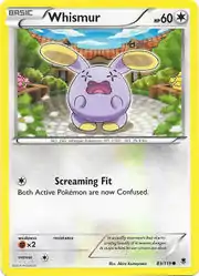 Whismur (Japanese: ゴニョニョ Gonyonyo) is a Colorless-type Basic Pokémon card. It is part of the Phantom Forces expansion.