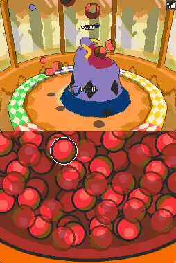 Swalot Plop (Japanese: ばくばくマルノーム Chomp-Chomp Marunoom) is a game played on a big Swalot-shaped machine which utilizes more of the game's 3D capabilities. Players toss little, round Berries into the machine's mouth using the touch screen. The rotating Swalot swallows the Berries and spits them out later. The player obtaining the most points gets their Tap Toy upgraded. A minimum of two players can play, and a maximum of four players can play.