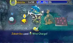 Wild Charge inflicts damage to the enemy and the user receives recoil. In Gates to Infinity and Pokémon Super Mystery Dungeon, the recoil damage is 10% of the user's max HP, rather than being affected by the damage dealt to the enemy.