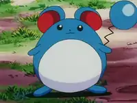 Later, Misty accidentally shouted at Marill and it ran off, leaving its bow behind, but Misty found it seconds later. It developed a liking to Pikachu, holding his hand whilst walking and shared food with him, but still cried when Misty tried picking it up. Then, Marill found a field full of flowers and started to spray it with water, making a bunch of Beedrill come out of the field and attack the group. Pikachu was able to send them flying with a Thunder Shock. Suddenly, it started to rain, and Misty, Marill and Pikachu took cover under a hollow tree. Marill was scared of the lightning and ran off, but Misty followed it and saved Marill when a tree was about to crush it. Marill then developed a likeness for Misty. After the rain cleared, Team Rocket appeared once again and grabbed Pikachu and Marill. Misty grabbed it and was ultimately saved by Ash's Chikorita. In the end, they sent Team Rocket blasting off, and Marill was returned to Wilhomena. Marill found it hard to leave Misty but left with her Trainer in the end. It reappeared in a flashback in the Japanese version of Gotta Catch Ya Later!. Marill's only known move is Water Gun. | ||