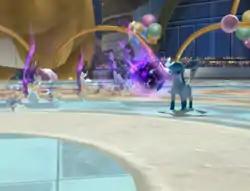 | Mega Banette forms three white, light-blue, purple, and dark-purple fireballs, one on each hand and one in front of its mouth. It then launches the fireballs at the opponent. The fireballs will follow the opponent until they hit. | |||