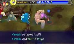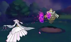 Yamask forms a pink, light blue and dark blue fireball between its hands and fires it at the opponent. Yamask can also control where the fireball can go. | ||