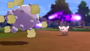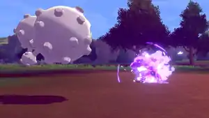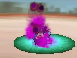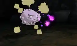 Koffing creates a ring of pink, light blue, and dark blue fireballs around its body. It then spins rapidly, firing the fireballs at the opponent. | ||