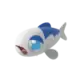 In its School Form, Wishiwashi resembles a large fish roughly formed from various smaller fish with glowing eyes. Starting with its head, its body is divided into four bands that each becomes a slightly darker shade of blue. A ring of bright blue glowing spots lines the front edge of the two middle bands. The centers of its "eyes" are formed by a single white fish with glowing eyes for pupils. Surrounding the white fish is a dark blue recess, and at the rear edge of the "eye" is a raised white area for eyelids. Above each eye is a single, dark blue fish shape. Wishiwashi's mouth gapes wide open, apparently unable to close fully due to gaps on each side. Its lips in the front are lined with glowing spots, and many more spots dot the inside of its mouth.