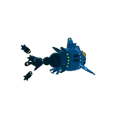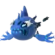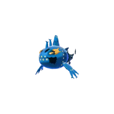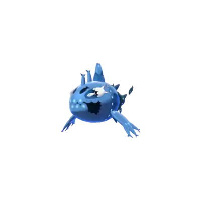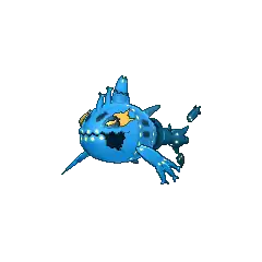 On each side of the School Form's body, in the second band, there is a pair of dark blue fish-shaped recesses. Wishiwashi is able to fire fish-shaped torpedoes from this area. Its pectoral fins are the same color as its head and have three finger-like projections. There are glowing spots at the base of each "finger" and at the base of the fins themselves. On top of its head are two short projections shaped like fishtails, one behind the other. Additionally, Wishiwashi has a large dorsal fin that is darker around the base and has two glowing spots at the tip. The third section of its body has a ring of four spike-like fins around it. Three spikes encircle the tip of its tail, each with two glowing dots at the base. Dark fish shapes float freely a short distance from the end of each spike, all with two more dots on them. Finally, the tip of its tail is a rounded teardrop-shape with a single dot on each side.