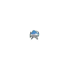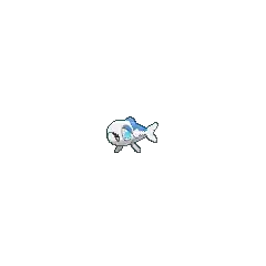 In its Solo Form, Wishiwashi resembles a small fish. It has large, light blue eyes with irises that resemble puddles of water and dark blue eyelids. The head and tail are both white. There is a line of white teardrop-shapes on each side of its body with the teardrop nearest the head being slightly larger. The top half of its body is dark blue and has a short, rounded dorsal fin. The lower half of its body is gray with two pectoral fins. This tiny Pokémon is both the shortest and lightest Water-type.