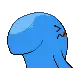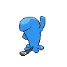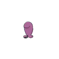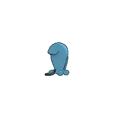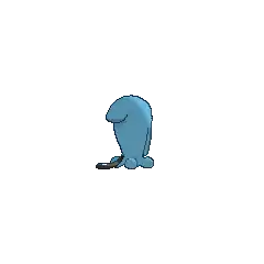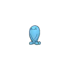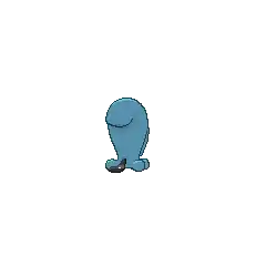 Wobbuffet is a tall, cyan Pokémon with a soft body. Its eyes usually appear scrunched, and it has a jagged upper lip. The female Wobbuffet has a red marking on its mouth that resembles lipstick, while the male does not. It has flat arms that are wider towards the tip and four stubby legs at the base of its body. There are two eyespots on its black tail. Its eyespots are revealed to be capable of blinking and looking around using its tail in the Pokémon Stadium series. Wobbuffet is very protective of its tail, to the point where it will suddenly turn uncharacteristically aggressive if the tail is attacked.