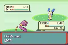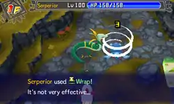 The target is now able to attack during Wrap's duration, and can act normally. Instead, it inflicts 1/16 of the target's maximum HP as damage for two to five turns upon use, in addition to the damage dealt when it is used. The text "Enemy <Pokémon> was WRAPPED by <user>!" will appear. It also traps the target, preventing switching and escape. If the user switches out, the target will be freed. If a trapped Pokémon uses Rapid Spin, it will be freed. While it's hurting target, the text "Enemy <Pokémon>'s hurt by WRAP!" appears. After it stops, it will say, "Enemy <Pokémon> was released from WRAP!"