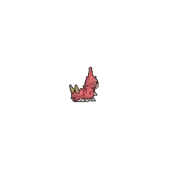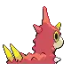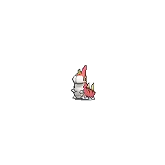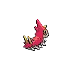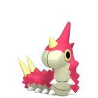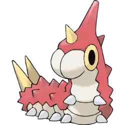 Wurmple is a small, caterpillar-like Pokémon. Its body is mainly red with a cream underside and face. It has large yellow eyes with dark pupils. It has one sharp yellow stinger on its head and two of them on its rear. It has a tall, erect, red spine behind its forehead and a similar, smaller spine behind that. It has small spikes running down the top portions of its body and five pairs of stubby white limbs.