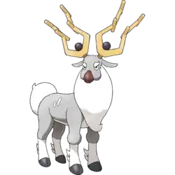 Wyrdeer is a snow deer-like Pokémon. It has a grey and white body with white spots and eyebrows. The antlers are gold with four spikes extending outwards and one black orb on each. Wyrdeer has a brown nose and black hooves. It has a white mane resembling a beard and a round white tail. The lower portions of its legs are white with spiky fur on each one.