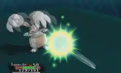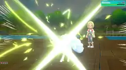 Bisharp's arms glow light blue. It then either crosses its arms in an 'X'-like shape and then throws the energy surrounding its arms at the opponent, with a magenta outline as the energy gets thrown. | ||