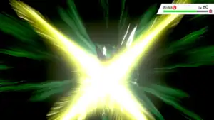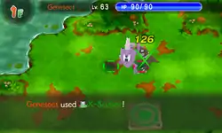 Pinsir's claws glow light blue. It then puts its claws together in front of it and a light blue 'X'-like energy with a magenta outline appears in front of its claws and it falls forward, slamming into the opponent; or, Pinsir's pincers glow light green and grow longer. It slashes at the opponent with its pincers in an 'X' formation, leaving behind a trail of light green energy from each of its pincers. | ||