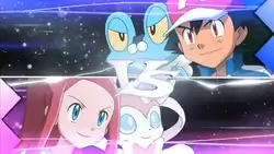 Somewhere in a forest, Ash has met the eye of a Trainer, who reminds him of the Trainer rule: they must now battle. Ash agrees, and the opposing Trainer introduces herself as Penelope, and releases her Pokémon, Sylveon. Ash has never seen the Pokémon before, and takes out his Pokédex which identifies it as an evolution of Eevee. Clemont tells him that Sylveon is a Fairy-type Pokémon, which is news to Ash. Bonnie remarks that Dedenne is also the same type. Despite never having battled or previously known the type, Ash sends out Froakie to battle. Before battling, Penelope asks Ash to promise one thing: that if she wins the battle, Ash will have to stay with her a while; flustering Serena. Ash, confident in his abilities, agrees, and begins the battle with a Bubble. Sylveon counters with Fairy Wind, which sends Froakie crashing into a tree. Sylveon follows up with Moonblast, but Ash instructs Froakie to jump out of the way, causing the tree's fruits to fall. Froakie hits the falling fruit at Sylveon, who hits them out of the way with its feelers. Ash claims that the attack was a decoy, and Froakie leaps from above with Water Pulse, which briefly dazes Sylveon. Ash sends Froakie to finish it, but Penelope has one final weapon, Attract. Froakie falls immediately and deeply in love with Sylveon. Ash commands it to pull it together, but Froakie does not listen. Sylveon uses Draining Kiss and kisses the enamored Froakie on the cheek, draining its energy and sending it to the floor, fainted. Ash runs over to retrieve Froakie, and Penelope tosses him an Oran Berry to heal Froakie. She says that since she won, as promised, Ash will be with her for a while, making Serena even more shocked.