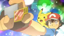 After recalling Hawlucha and remarking that Korrina and Lucario have gotten much stronger from training, Ash sends out Pikachu as his last Pokémon to battle Lucario. After a pause, Serena asks why neither Ash nor Korrina are making a move yet, which Clemont replies that their Pokémon can't afford to lose the battle and that they’re being extra careful. Starting off, Ash tells Pikachu to use Quick Attack as Korrina tells Lucario to draw it in. Still running, Pikachu prepares to use Electro Ball while Lucario uses Bone Rush. Pikachu manages to strike but Lucario's Bone Rush deflects the attack towards the ceiling. Pikachu tries an Iron Tail next, but Lucario blocks it and sends Pikachu flying with a kick. Ash tells Pikachu to use Thunderbolt while in mid-air, which hits his opponent much to Korrina’s surprise. Lucario retaliates with an Aura Sphere, though Pikachu returns to his feet following the attack. Korrina calls for a Metal Sound, immobilizing Pikachu. Thinking fast, Pikachu uses Thunderbolt to stop Lucario's Metal Sound. Lucario also uses Aura Sphere, but Pikachu manages to deflects it with his Iron Tail, as Clemont states that's the same Draco Meteor Climb Strategy from the Cyllage Gym battle with Grant. Korrina tells Lucario to use Bone Rush as Ash calls for another Iron Tail to block. During the collision, they’re both hurt but standing. Lucario follows on with Power-Up Punch, which clashes with Pikachu’s Iron Tail. Pikachu goes for an Electro Ball next while Lucario uses Aura Sphere, again the attacks collide. Finally, Pikachu uses a Thunderbolt that hits Lucario which it wasn't able to dodge, knocking Lucario out and returning it to its normal form. While Korrina was defeated, Gurkinn finally admits his granddaughter put up an excellent fight. Korrina picks herself up and gives Ash the Rumble Badge in recognition of the victory.