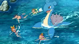 After some medical attention, Lapras is feeling much better, but it keeps looking out toward the water and crying. Clemont figures out that it misses its ocean home, and the kids decide to take it back there. Despite a boulder blocking the way and a run-in with Team Rocket, Lapras is soon reunited with its family.