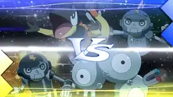 That night, Belmondo and Dark Clembot are about to break into the museum when Clembot attacks its imitation, startling Belmondo and causing Ash and his friends to run out and confront him. When Clemont demands to know Belmondo's reason for his actions, Belmondo relates his plan. He had seen Clembot and knew that he could add to it and make it better, so he created Dark Clembot with the design of using it to frame Clembot for several crimes and then continue committing said crimes without suspicion. Shaking with rage from Belmondo's abuse of scientific prowess, Clemont accepts his robot-against-robot challenge, determined to prove that Clembot is better than its counterpart. The battle begins without delay, with Dark Clembot pitting Belmondo's Magneton against Clembot and Clemont's Heliolisk. Because Clemont programmed Clembot to battle with the Pokémon's feelings in mind, Clembot gains the upper hand in the match due to Dark Clembot being programed to do nothing but attack. As Belmondo scorns Clemont's sentiments about caring for Pokémon and fighting together with them, both Clembot and Dark Clembot are magnetically drawn into the air by Team Rocket. The two robots are rescued by Blaziken Mask, but due to the damage they have both taken, Clemont and Belmondo agree to finish the battle themselves - Belmondo's Magnezone against Clemont's Luxray. As with the battle between Clembot and Dark Clembot, Clemont easily defeats Belmondo due to the professor's apathy towards his Pokémon's feelings and abilities. With his Pokémon defeated and his scheme revealed, Belmondo is arrested by Officer Jenny.