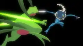 - When Sawyer's Grovyle uses Leaf Blade on Frogadier, Frogadier's entire face is dark blue.