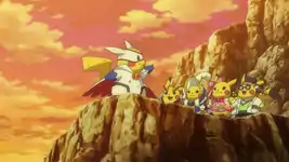 Pikachu Libre and its gang have captured Pikachu Belle and Pikachu Pop Star. Ash's Pikachu, dressed up as a superhero, is facing the gang. Ash, out of screen, then shouts to Pikachu to not give up. Serena quickly hushes Ash to stay quiet, but it is already too late, and the voice of another man cuts the scene.