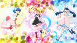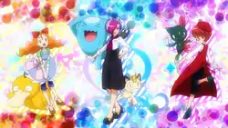 Outside, the group congratulates Serena on her win, pointing out her costume. Serena explains what happened, wondering if she should apologize to Valerie for cutting up the dress she made. Ash comments that Serena looked amazing in it; sneaking from behind, Miette agrees as well, surprising Serena. Miette congratulates Serena but declares that she will win the next competition, and the two rival Performers shake hands. Leaning in, Miette reminds Serena she hasn't forgotten about their "other" competition, referring to Ash, once again flustering Serena as she bids the group farewell. The episode closes with Serena looking proudly at her first Princess Key.