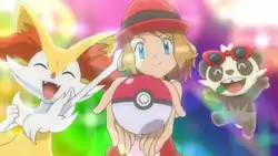 - After Serena leaves her tent alongside Braixen and Pancham, she is shown walking out barefoot, but in the next frame, she is wearing sandals.