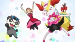 Finally, Pierre introduces Serena as the last Performer. Serena begins by having Braixen and Pancham leap away from each other, with Braixen releasing fire from its branch and Pancham beating the fire away with Arm Thrust, dispersing it as sparkles. The three of them begin dancing in the same style as Eevee, with a flashback revealing that Serena requested Eevee to teach them its dance moves so Serena can incorporate them into her performance. In the audience, Serena's friends begin swaying with Serena's groove, excited by her performance. Pancham eventually uses Stone Edge on the floor, summoning rock pillars for Braixen to dance off before it finally uses Fire Blast, launching a fire formation that explodes and sends glittering sparkles all over the audience. The theater cheers wildly for Serena while Eevee watches, awestruck.