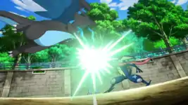 Alain wants to see more of what Ash’s Greninja can do, so he challenges it to a battle against his Charizard—and when Charizard Mega Evolves and Greninja’s appearance changes again, the battle becomes intense! Greninja is ultimately defeated, but everyone is eager to learn more about this mysterious transformation!