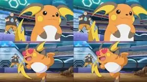 - Shortly after Tierno sends out Raichu for the second time, the back of Raichu's right ear is completely yellow instead of brown.