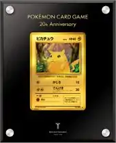 A special collaboration between Pokémon and Tanaka Kikinzoku to mark the TCG's 20th Anniversary saw the release of the 20th Anniversary Pikachu Solid Gold Card (Japanese: 20周年記念 ピカチュウ 純金製カード). This made to order item features a representation of Pikachu from the initial Expansion Pack printed on a rounded rectangular piece of 24-karat gold weighing 11g. The item is pre-mounted in an acrylic display case and comes in a specially designed box bearing the Pokémon Card Game 20th Anniversary logo and Ginza Tanaka jeweller logo. Reservations for the item opened on October 19, 2016 and closed after November 7, 2016. Orders began to be shipped in late December 2016. The item was sold at a price of ¥200,000 plus tax.
