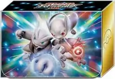 Deck case: The Mega Mewtwo X & Mega Mewtwo Y Deck Case (Japanese: デッキケース メガミュウツーX・メガミュウツーY) is adorned with the two forms of Mega Mewtwo, recycling elements from the Blue Shock and Red Flash booster pack artwork. The deck case includes 2 card dividers featuring similar designs and can store up to 180 cards.