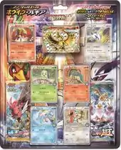 The Ho-Oh + Lugia Special Set (Japanese: スペシャルセット ホウオウ+ルギア) was released on April 23, 2016 as part of continued celebrations of the opening of the Kyoto Pokémon Center back in March. Referencing its connections with Kyoto, the set includes promotional reprints of the Johto starter Pokémon Chikorita, Cyndaquil, and Totodile, a promotional reprint of Smeargle, and new Ho-Oh and Lugia promotional cards. Each of the reprints feature a star Holofoil treatment and have the Pokémon Center logo below their artwork. The set also comes with 5 Rage of the Broken Heavens booster packs and 5 Awakening Psychic King booster packs. The set could be purchased at all Pokémon Centers across Japan, on the Pokémon Center Online, and in some Pokémon Stores.