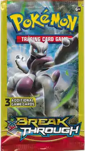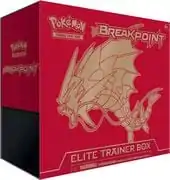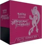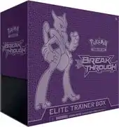 The BREAKthrough expansion features two different Elite Trainer Boxes, one for both Mega Evolutions of the Genetic Pokémon Mewtwo. The one featuring Mega Mewtwo X contains purple packaging and sleeves, with blue dice, while the one featuring Mega Mewtwo Y contains maroon packaging and sleeves with red dice. Each Elite Trainer Box contains a stock of Energy cards, 65 card sleeves themed around the featured Pokémon, 6 damage counter dice, a coin-flip die, two acrylic Special Condition markers, the BREAKthrough Player's Guide for the expansion, and a collector's box.