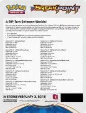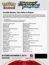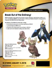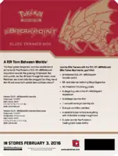 The release of the BREAKthrough expansion on November 4, 2015 marked the start of the XY BREAK Series, essentially a continuation of the XY Series with particular focus on the Pokémon BREAK mechanic that would go on to be a facet of the expansions that followed. An array of promotional boxes, play accessories, and other merchandise was made available to players and collectors of the Pokémon Trading Card Game alike. The following is a chronological list of all TCG related merchandise made available during this Series.