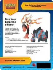 Also released with the Evolutions expansion was the Evolutions Collector's Album. It features Pikachu and Mewtwo on the front and Mega Venusaur, Mega Charizard Y and Mega Blastoise on the back, and a 60 single-pocket pages. A booster pack of Evolutions was included with it.